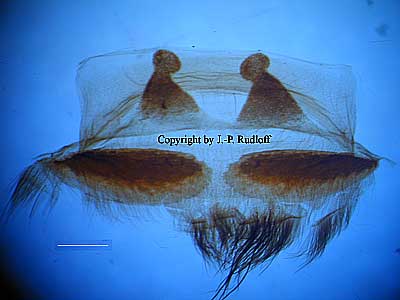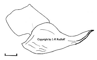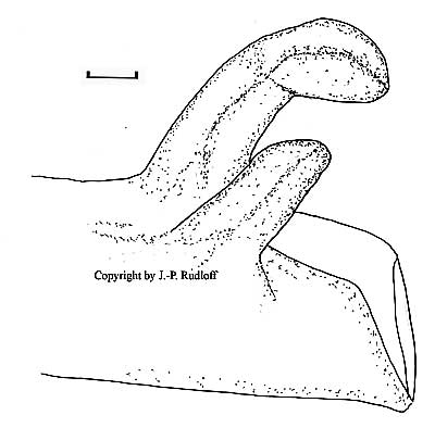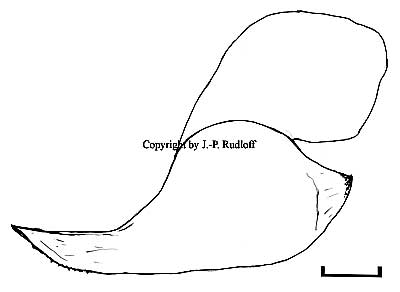| Bulbus: mit recht langer, schlanker Bulbusspitze. Der Subapikalkiel ist deutlich gesägt der prolaterale Innenkiel dagegen unbezahnt und glatt. |