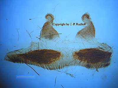 | Tibiapophyse: Apophyse rl im letzten Drittel ventrolateral abgewinkelt, nicht spitz sondern eher massig stumpf endend. Die prolaterale Apophyse ist fingerförmig und gerade. Der Met kommt beim Einknicken sehr deutlich auf der rl Apophyse zum liegen. |