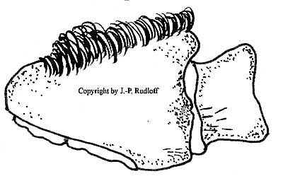 | Bulbus: SA über die gesamte Bulbusspitze gesägt. A deutlich nach pl gebogen und so verdreht das er lat ausgerichtet ist. PI viel kürzer als SA und glatt. TA in pl und rl gut ausgeprägt. |