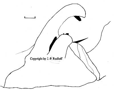 | Tibiaapophyse: rl Tibiaapophyse etwa doppelt so groß wie pl und nach pl gebogen. Pl Tibiaapophyse kräftig und fingerförmig subap rl ventr mit einem eng anliegenden kräftigen Dorn. Rl Apophyse sap pl leicht dor mit abstehendem kräftigen Dorn. rl Apophyse ragt etwas höher als der Gelenkknick zum Met. Met 1 kommt auf rl Apophyse beim Einknicken zum Aufsitzen. |
