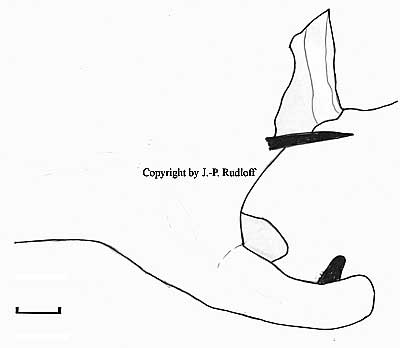 | Diagnose: Im männlichem Geschlecht deutlich durch die Geschlechtsmerkmale von allen anderen Arten zu unterscheiden, das Gleiche gilt für die Spermathek beim Weibchen. Die Färbung ist ein sehr gutes erstes Identifikationsmerkmal. |