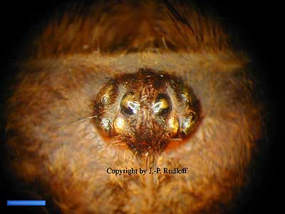 | Färbung: braun, mit deutlich violettem Schimmer auf Cephalothorax und Femora. |