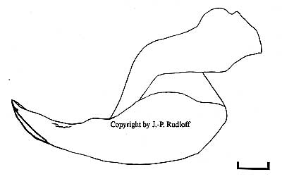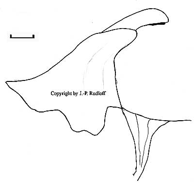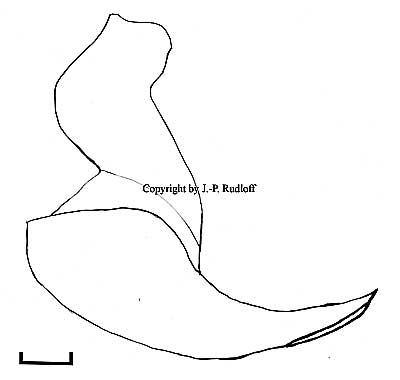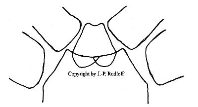 | Spermathek: Die receptacula seminis mit breiter Basis, nicht kegelförmig aber auch nicht dreieckig. Innenseiten prolateral leicht nach innen gewölbt. Die Rezeptakeln berühren sich nicht an der Basis. |